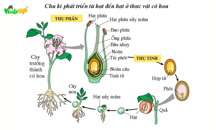 Ở thực vật có hoa, sinh sản hữu tính diễn ra thông qua thụ phấn và thụ tinh. Hạt phấn từ nhị hoa được chuyển đến đầu nhụy, sau đó ống phấn phát triển đưa giao tử đực vào noãn để thụ tinh.