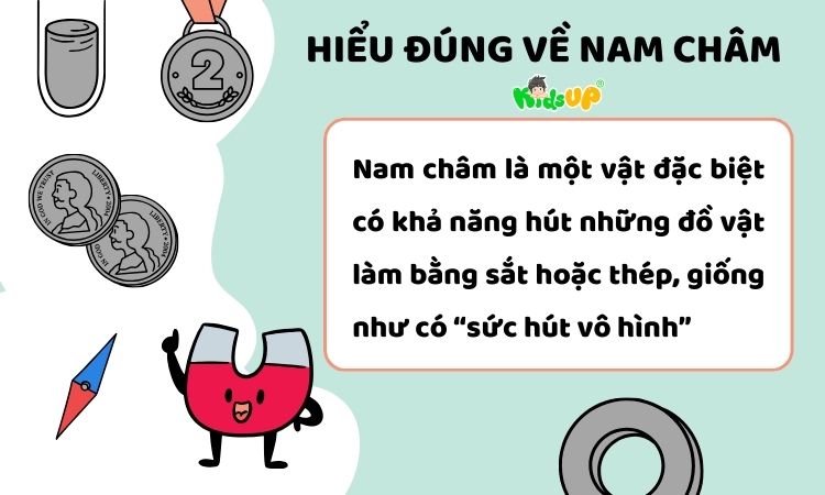 Nam châm là một vật đặc biệt có khả năng hút những đồ vật làm bằng sắt hoặc thép, giống như có “sức hút vô hình”. Với trẻ nhỏ, cha mẹ có thể ví nam châm như một “bàn tay phép thuật” – không cần chạm vào nhưng vẫn kéo được đồ vật lại gần.